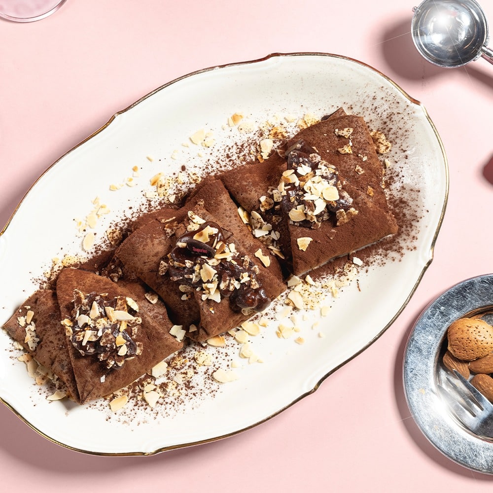 Clătite cu aluat cu cacao, umplute cu cremă de fistic și fistic crocant